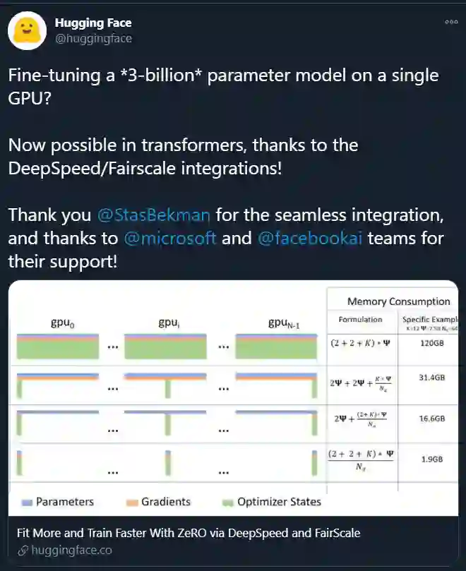 目前,Hugging Face 的 transformers 库与 DeepSpeed 进行了实验性集成,使用方法和基准测试结果参见:https://huggingface.co/blog/zero-deepspeed-fairscale。
