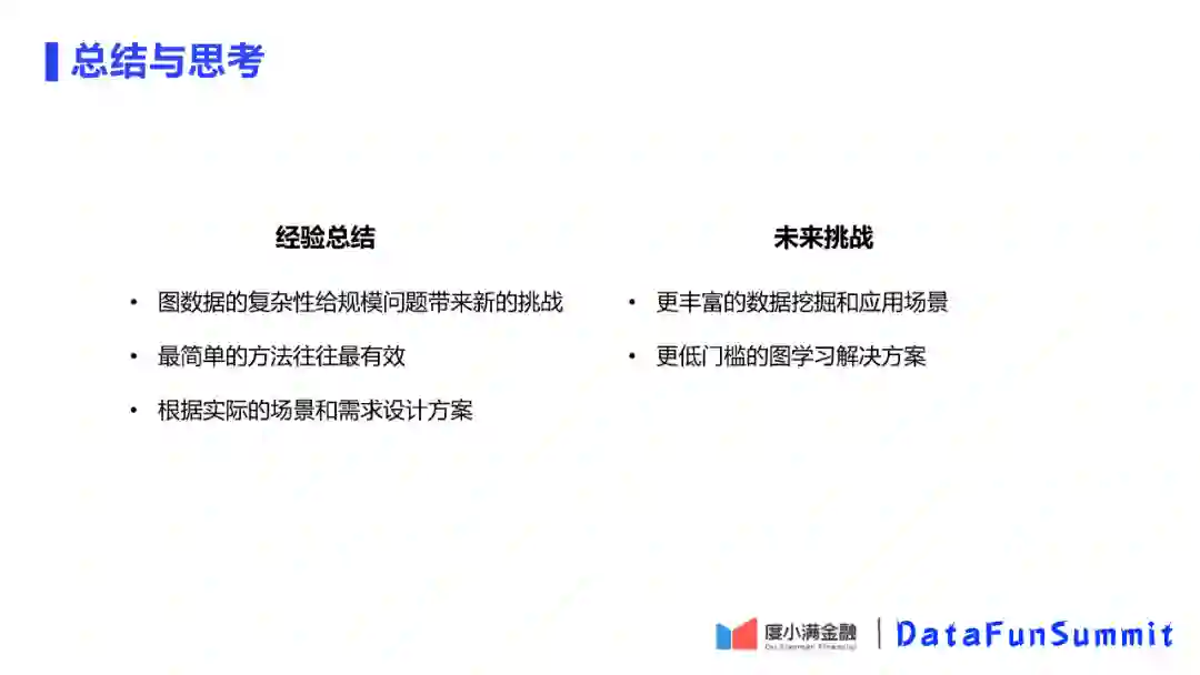 首先,在建设过程中发现图数据的复杂性会给规模问题带来新的挑战,这与传统的数据不同,传统数据一般是线性增长,而图数据可能会有爆发式增长的情况,在解决这类问题上要多采用降维的思想,另外可以考虑使用并行、缓存等方法,最简单的方法可能是最有效的。另外在建设平台过程中,需要针对实际的场景设计方案,如果设计的方案在实际的训练、结果过程中有一个好的表现,那么它就是一个好的、适用的方案。