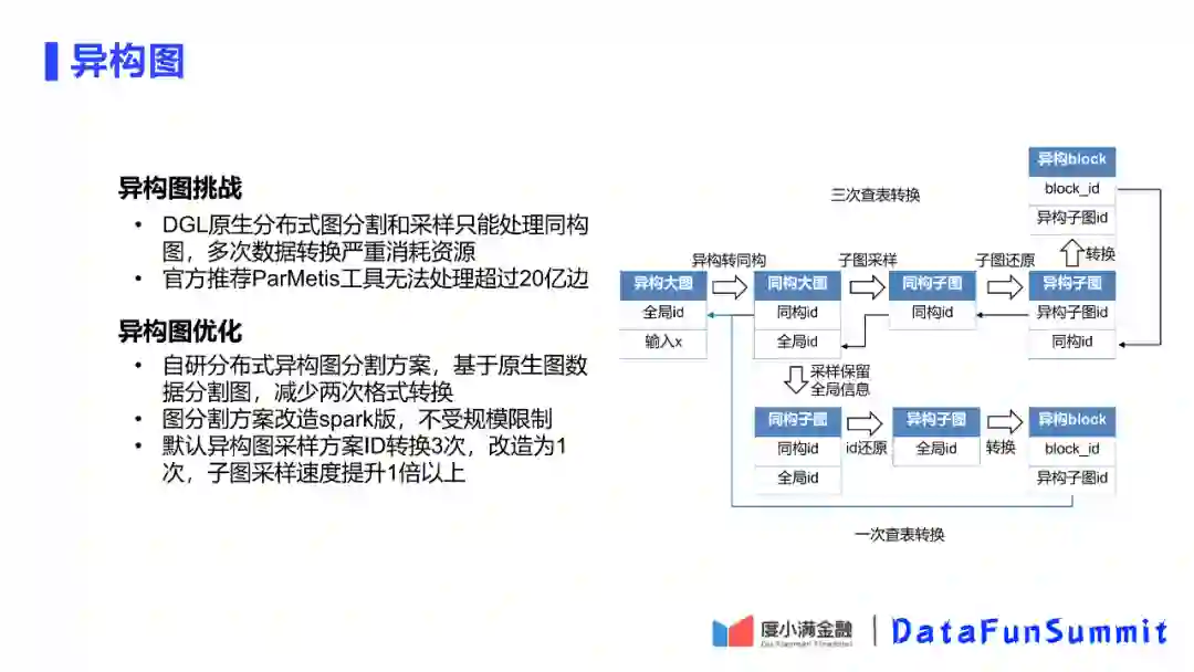 度小满通过自研的分布式图分割方案解决了这一问题。基于直接导出的图数据进行分割,这样可以减少两次转换过程,同时该方案被改造部署在了spark上,因此可以不受规模限制,可以运行任意规模分割。另外在异构图的采样过程中,将DGL推荐的效率较差的多次转换的方案进行了优化,改造为了1次,从而提升了采样速度。