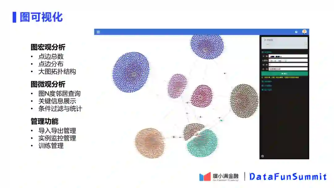 最后图平台提供了三个可视化功能。图宏观分析可以查看图的点边总数、点边分布、图和图之间的关联拓扑;图微观分析包括图N度邻居查询、关键信息展示、基于条件的过滤与统计功能,可以辅助业务分析;管理功能包括三方面,导入导出管理功能,导入就是对于上游的数据源是什么,设定导入任务多久启动一次,导出可以管理从异构大图中导出子图,实例监控管理可以查看数据分布以及健康性,训练管理可以选择模型和数据进行训练。