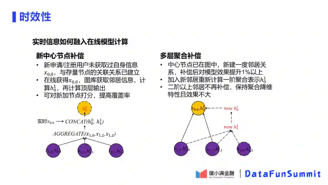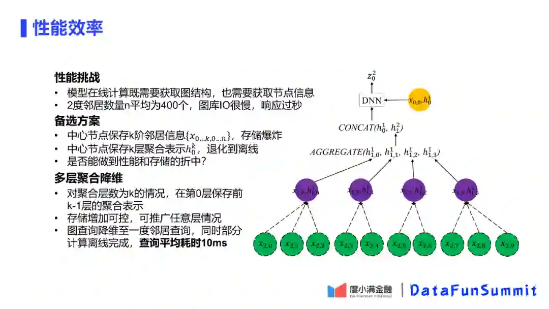 如图中的h01,上标表示第1层的聚合结果,下标表示是第0层的节点,而第0层节点表示的就是中心节点。度小满考虑的方式是对在倒数第二层保存以下所有层的节点的聚合结果。这样既不需要保存所有原始信息,也可以将查询缩减到查1的情况,从而得到性能保障。在真正模型计算时,对于中心节点,会对所有邻居节点进行聚合表示(上标为1),然后将该表示结果与中心节点的第一层聚合结果进行拼接,然后将结果放入DNN,最后得到期望输出Z02。