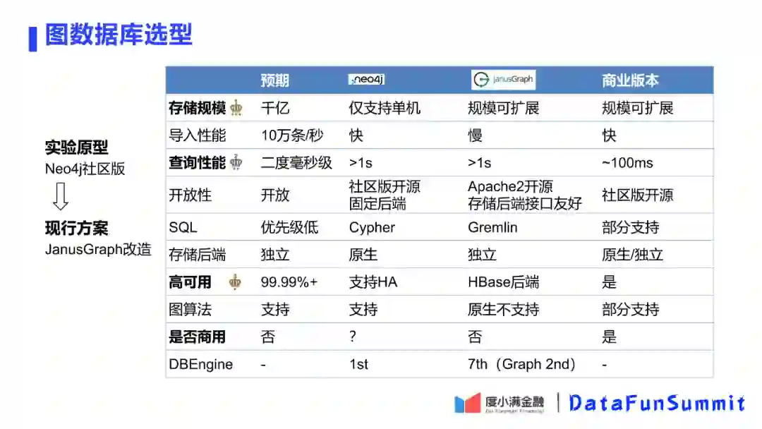 Neo4j只有HA,但不是分布式版本;除了本身集群的健壮性还要考虑是否有很好的运维方式。JanusGraph有HBase的后端,节省了运维成本。开源版本还是商业版本,商业版本健壮性高,但是一旦出现问题是否能及时进行处理不能保证;商业版本的私有化是封闭的版本,在这上面是否能做二次开发或者更深一步的优化,这个也是待考虑的问题。最后选择了JanusGraph,主要看中可扩展性。