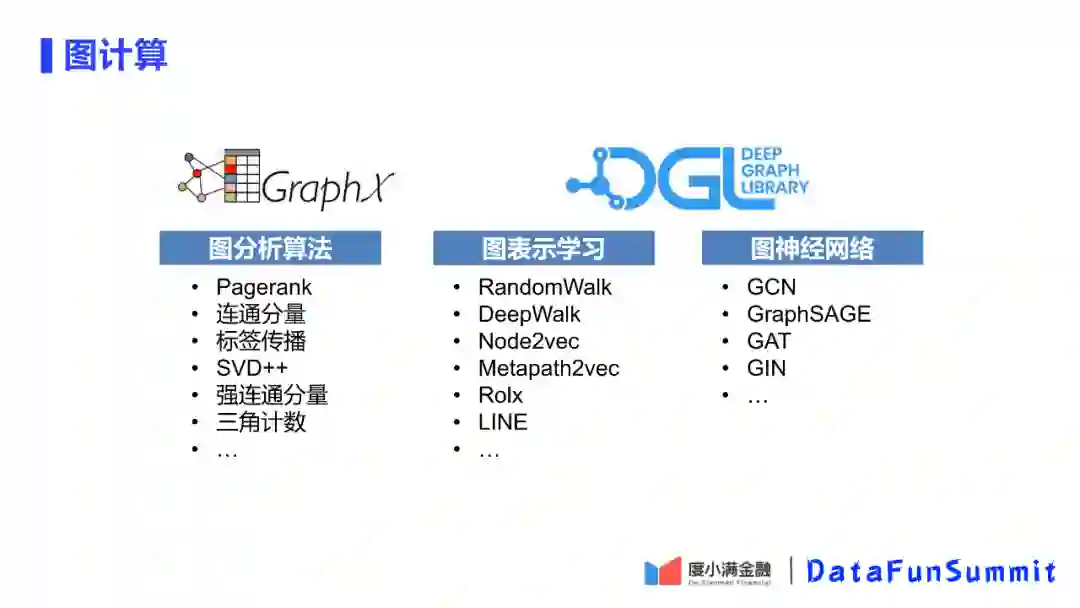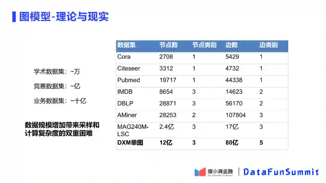 首先看一下实际遇到的问题与公开数据集的差异。表中前6行是公开模型数据,前3行是同构图数据、后3行是异构图数据。学术数据规模在10w以内,第7行的比赛数据,达到了亿级规模,这对于学术界是超大规模了。但度小满单个模型训练的数据集已经达到了10亿级别,比比赛的公开数据集又大出一个量级。所以学术数据集、竞赛数据集、业务数据集有一个巨大的鸿沟。另一方面图的数据是有关联的,例如Node2vec的邻接矩阵,当点边关系增加,矩阵规模会膨胀迅速,因此在训练中如何解决规模问题是训练中要考虑的重点。