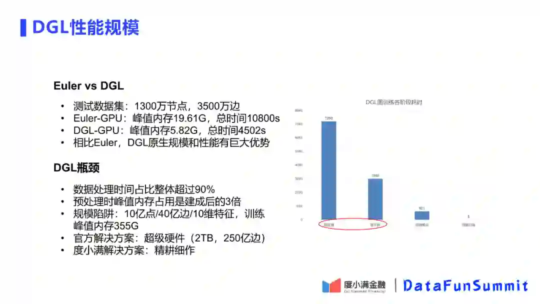 通过分析统计整个训练过程的时间性能,发现预处理和采样这两个过程会占到DGL图训练整个阶段的时间的90%以上。而此处还有一个规模陷阱,在预处理时所需要的内存空间是与处理后数据所需内存空间的3倍。虽然对于DGL官方依托于AWS使用了一个超级硬件来解决这个规模陷阱问题,但是这对于大部分的公司无法使用到这样的硬件,对于度小满来说需要对整个过程做一个精耕细作的优化。