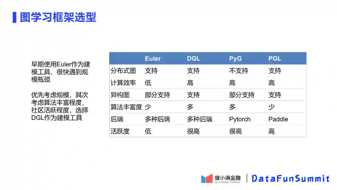 对于图学习目前没有完全成熟的框架,度小满最早使用Euler作为建模工具,但是很快到规模瓶颈。最后选择了DGL作为建模工具。在建模工具选择时,最优先的考虑就是是否支持大规模学习,因此排除掉了PyG,虽然该模型工具在学术界流行,但无法支持分布式训练。