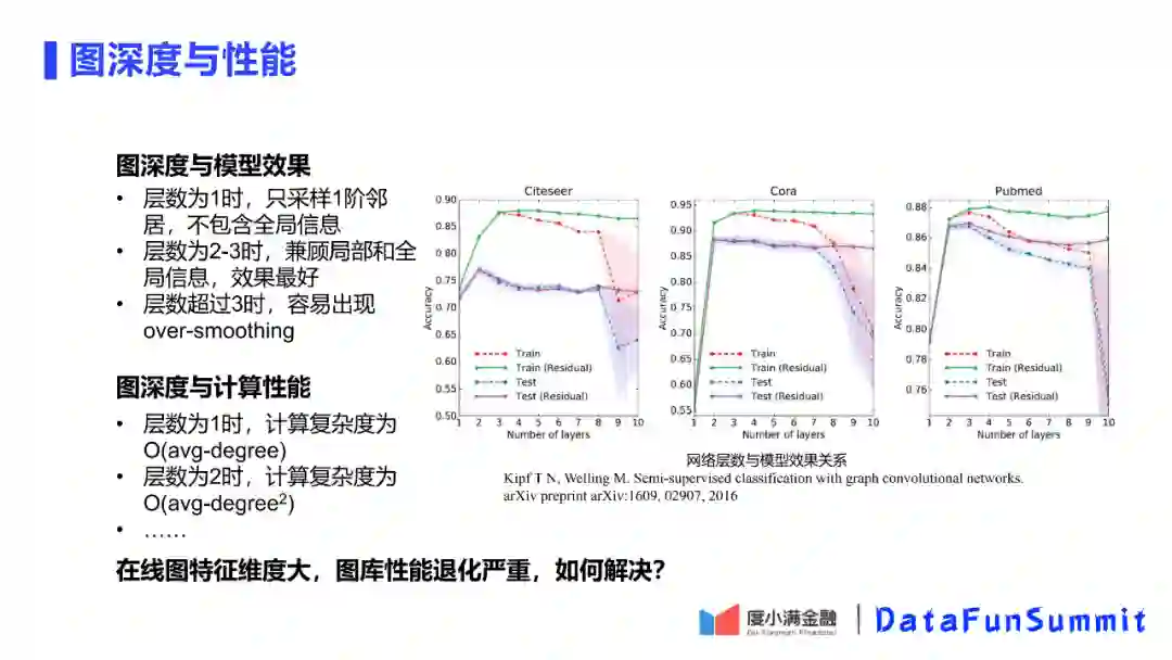 刚才讲到图模型的采样深度是两层的,这里引用GCN文章的一个评测结果进行分析,为什么会选择两层的采样深度。