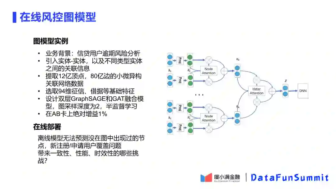 首先讲解一下在线部署的风控图模型的基本情况。该模型的业务背景是信贷风险分析,判断用户好坏。模型引入了实体和实体的联系,包括人和人、人和公司关系。整个图是一个异构图,具有12亿顶点与80亿边,而其中每个人又选择了94维以征信为主的特征。