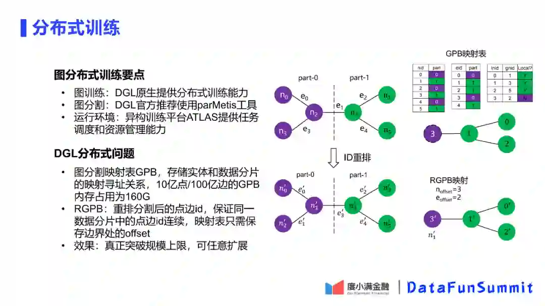 但是DGL的分布式训练本身会存在一些问题,数据分片之后,ID会进行重分配。需要能从新的ID找到原来的global的一个GID,因此需要存储一个映射表。映射表使用的是Key-Value的查询方式,对于100亿边的图所需要的映射表内存占用为160G,因此映射表就会吃空资源。