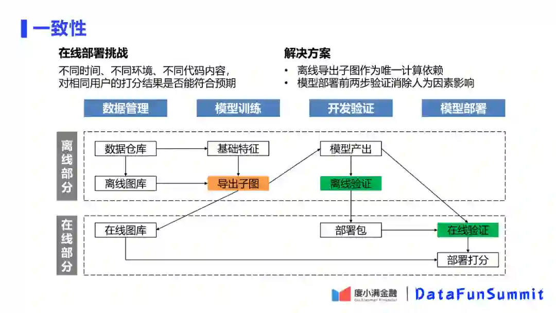 首先可以将整个在线打分的过程分为离线部分和在线部分。其中关键的部分是将数据仓库以及离线图库的导出子图作为离线训练和在线打分唯一的数据来源。既用于离线训练,也用于在线的数据导入。另外在部署模型包前要先做一次离线验证,保证本地打分与训练的结果是一致的。在模型部署上线后,也进行一次在线验证,保证在线环境得到的分数也和预期的一致。用数据一致性和计算一致性保证在线打分的一致性。