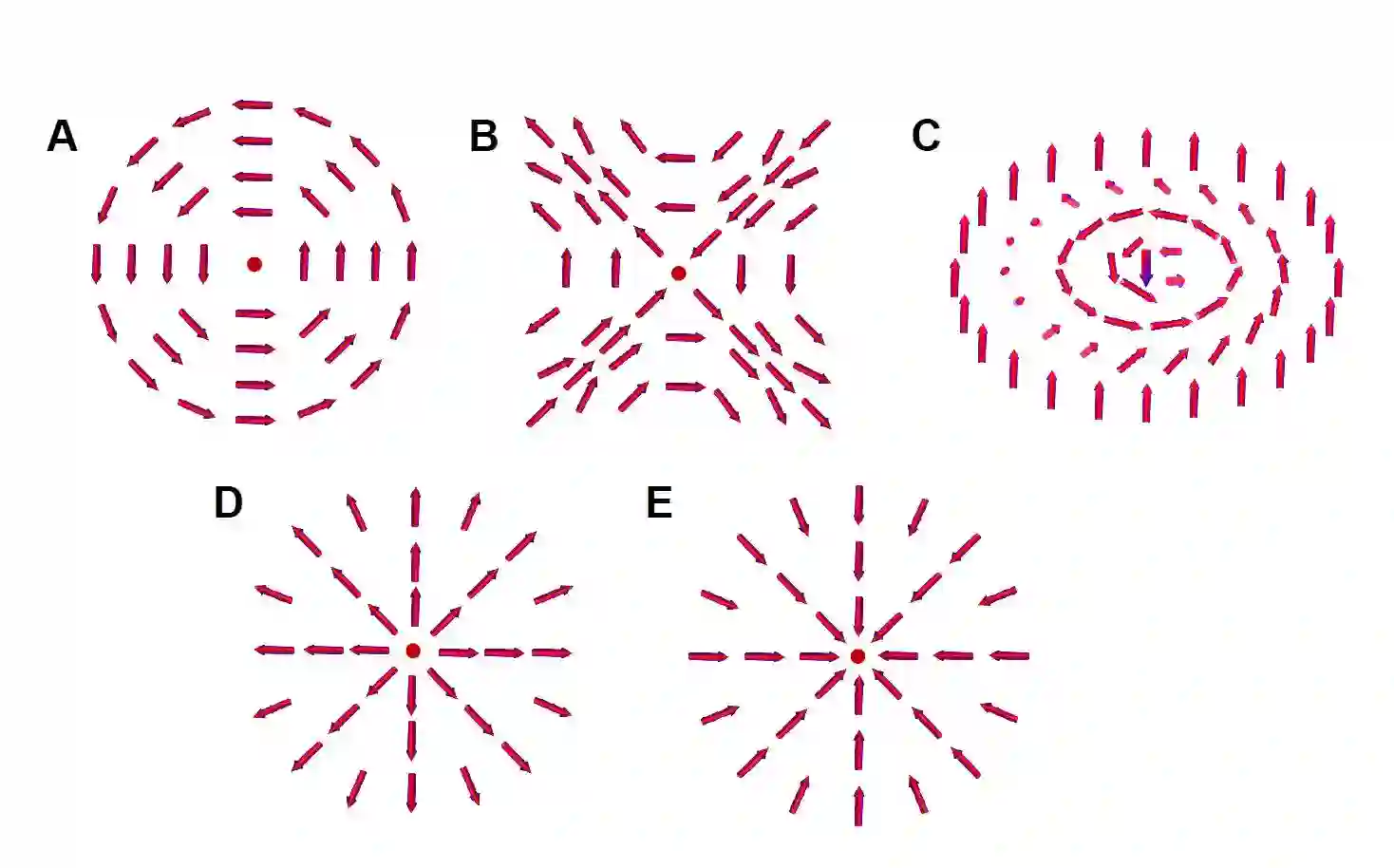 图1. 铁性材料中几种拓扑畴示意图。A:流量闭合的涡旋畴 (Flux-closure vortex),B:反涡旋畴 (Anti-vortex),C:斯格尔米子畴(Skyrmion),D:中心发散型拓扑畴,E:中心收敛型拓扑畴。