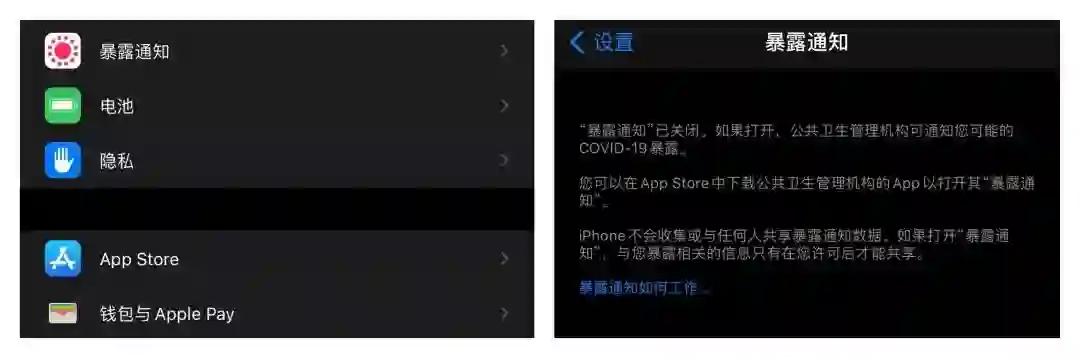 在此版本「设置」首页中,新增了「暴露通知」选项,用户可以下载有关 App 以打开「暴露通知」选项。未下载相关 App 时,该选项处于关闭状态。