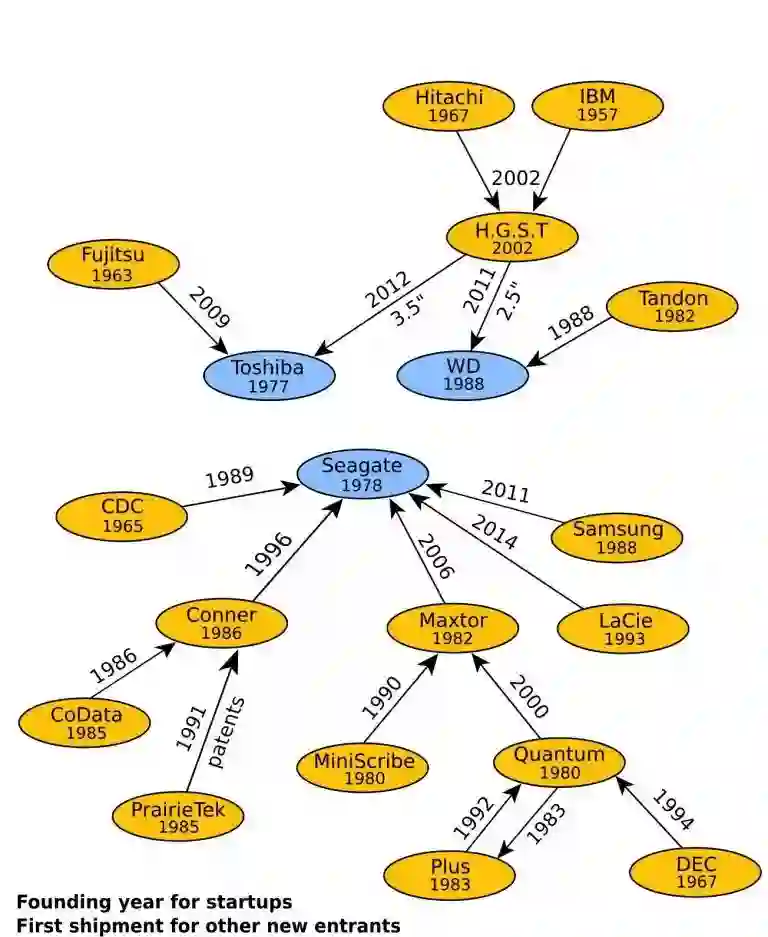 过去至少有221家公司是机械硬盘(HDD)厂商。由于破产或并购,这个行业的大多数玩家现已销声匿迹。最早进入的四家厂商如今没有一家继续深耕这个行业。如下图所示,存活下来的几家厂商是希捷、东芝和西部数据,它们都至少一方面是通过并购发展起来的。