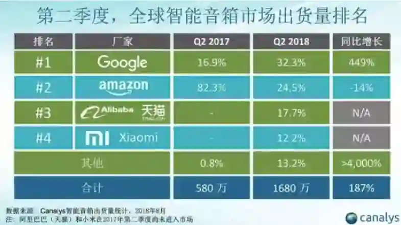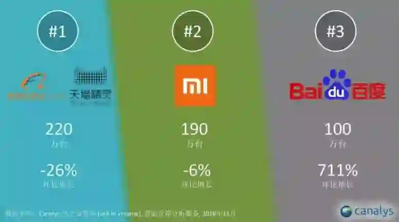 Canalys 发布的 2018 Q1 全球智能音箱报告显示,阿里巴巴天猫精灵以 110 万出货量排到全球第三,中国第一。