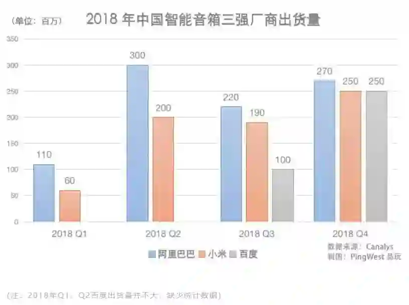 巧合的是,同一天调研机构 Canalys 发布了中国智能音箱市场 2018 年 Q4 和全年出货量数据。两件事对比起来看,展现了一个非常有意思的局面:腾讯智能音箱业务变动之时,中国智能音箱市场已经形成了稳定的三强格局:2018 年第四季度,阿里巴巴天猫精灵系列出货量约为 270 万台,百度小度系列和小米小爱系列的出货量都在 250 万左右。