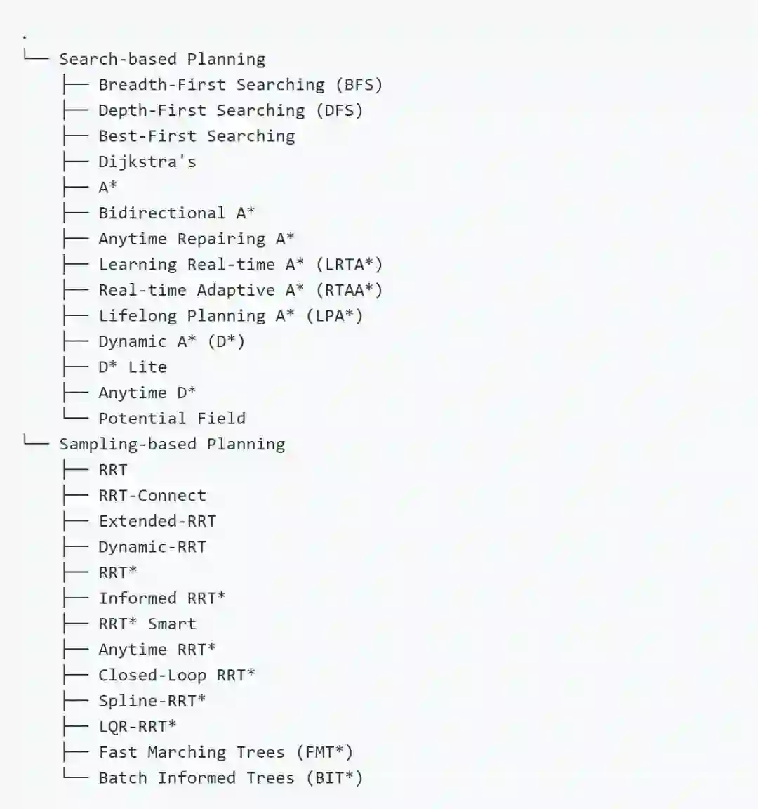 该开源库中实现的路径规划算法包括基于搜索和基于采样的规划算法,具体目录如下图所示: