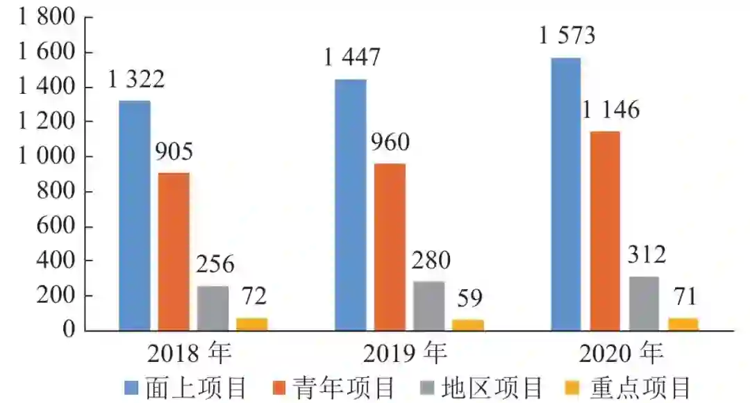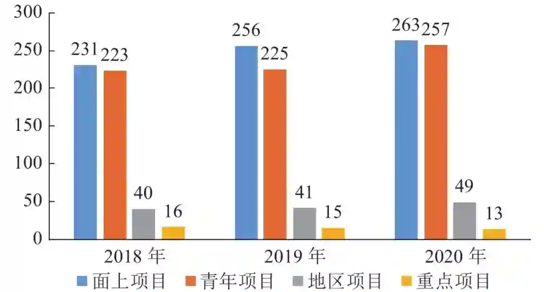 从平均资助强度 (图4) 上来看, 2020年度由于新冠疫情的影响, 面上项目、青年项目、地区项目和重点项目的资助强度较前一年均有一定幅度的缩减, 分别为−1.19万元/项、−0.22万元/项、−2.39万元/项和−3.9万元/项. 但面上项目、青年项目和地区项目的平均资助强度变化程度较小, 也显示出常规项目在资助额度上的差异会越来越小.