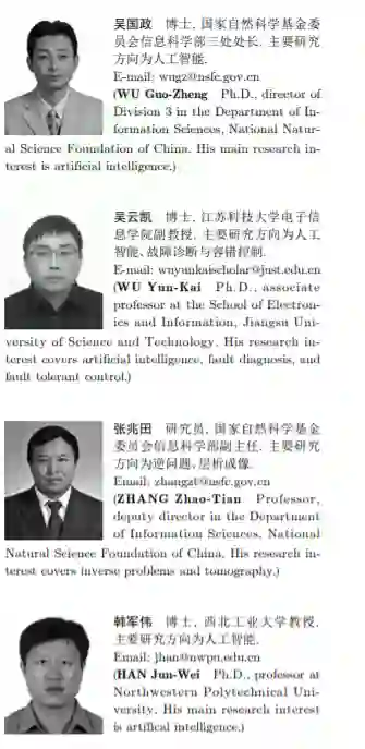国家自然科学基金委在2018年调整了学科代码, 并单独设置了人工智能一级学科代码(F06), 主要资助信息科学中人工智能领域的基础研究、前瞻性探索研究以及面向国民经济和国家安全的应用基础研究. 强调围绕人工智能领域的核心科学问题与关键技术, 进行原创性、基础性、前瞻性和交叉性研究, 鼓励在人工智能基础、机器学习、机器感知与模式识别、自然语言处理、知识表示与处理、智能系统与应用、认知与神经科学启发的人工智能等方向展开理论与方法的研究[1]. 在此之前, 为了贯彻国家科技战略规划布局, 推动我国人工智能基础研究, 引领人工智能技术发展, 培养人工智能创新研究队伍, 国家自然科学基金委员会于2017年初启动人工智能基础应急管理项目, 主要面向人工智能前沿基础、智能自主运动体、复杂过程智能优化决策三大方向, 每个方向涵盖若干主题, 支持科学家开展相关研究. F06代码的设立, 极大地提升了科研人员从事人工智能基础研究的热情, 对于信息科学部的学科深度和广度延展具有重大意义.