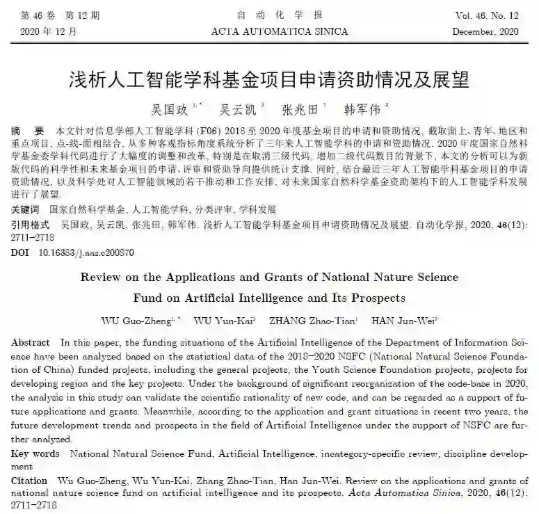 自动化学报最新一期刊登来自吴国政,吴云凯,张兆田,韩军伟撰述的《浅析人工智能学科基金项目申请资助情 况及展望》,是申报F06方向项目值得参考的指南。