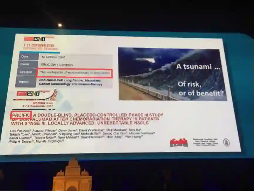 Johan Vansteenkiste教授在开场中提到,如果说去年ESMO年会的Keynote-024研究是肺癌免疫治疗的“地震”,那么今年PACIFIC研究可以说是一场“海啸”,这场海啸带来的是“风险还是获益呢?(of risk or of benefit?)”