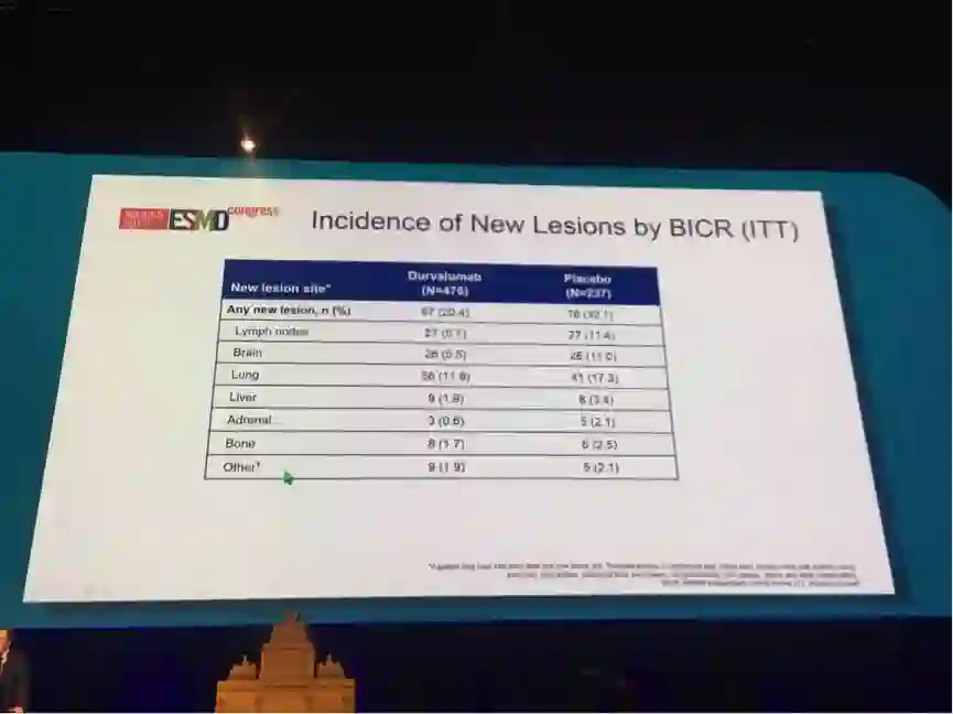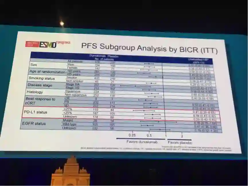 在预设的所有亚组(包括PD-L1表达状态)中,均观察到Durvalumab组PFS的获益。此外,使用Durvalumab的患者与服用安慰剂的患者相比,发生肿瘤转移的风险更低。
