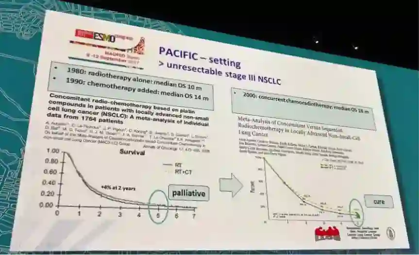 PACIFIC研究的入组人群:不可手术切除的III期NSCLC,这部分患者的治疗模式从1980的单纯放疗,发展到1990年的放疗联合化疗;2000年后正式确立了同步放化疗的地位。患者的中位OS从10个月延长至18个月。