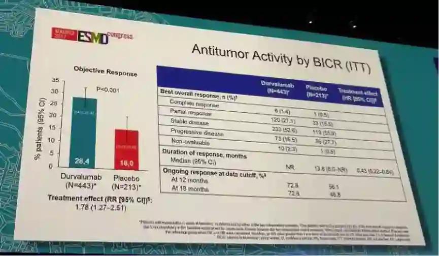Durvalumab组对比安慰剂组,显著提高ORR,两组分别为28.4% vs. 16.0% (RR=1.78; 95%CI:1.27-2.51)。中位疗效持续时间分别为未达到vs. 13.8个月(HR=0.43;95%CI:0.22-0.84)。