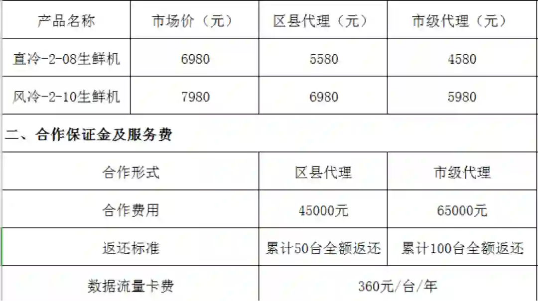 一位生鲜柜硬件销售负责人告诉灵兽,机器多为购买,代理商价格一台4580元,而购货商的价格在6580元,且货源供应链需要自行解决。