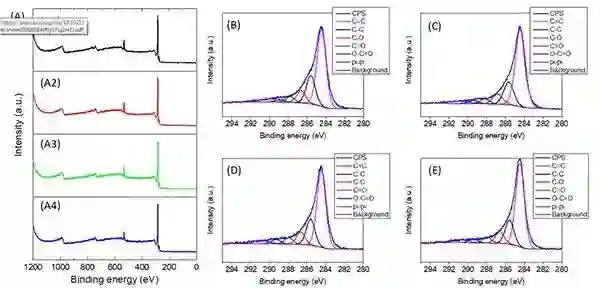 图2. (A) 全谱XPS扫描(A1) Ho-GO-BD, (A2) Hu-GO-BD, (A3) Ho-GO, (A4) Hu-GO、高精度 XPS :C 1s (B) Ho-GO-BD, (C) Hu-GO-BD, (D) Ho-GO,(E) Hu-GO.