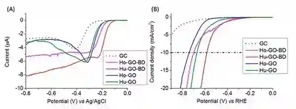 最后,作者测试了一下电化学性能,如图3。图3A,起始电位分别为 -273 mV (vs Ag/AgCl) (GC), -207 mV(Ho-GO), -210 mV(Hu-GO), -173 mV for(Ho-GO-BD), -139 mV(Hu-GO-BD),相比于GC,四种材料电化学性能都得到了提升,