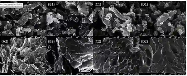 作者利用两种方法来合成石墨烯,一种是Hoffmann method,加了鸟屎(bird dropping)和不加鸟屎的分别记为Hu-GO-BD和Hu-GO,另外一种是Hummers method,加了鸟屎和不加鸟屎的分别记为Hu-GO-BD和Hu-GO。然后作者对其进行了表征。扫描电镜(A) Ho-GO-BD, (B) Hu-GO-BD, (C) Ho-GO, (D) Hu-GO表征可以看出石墨烯的片层结构,
