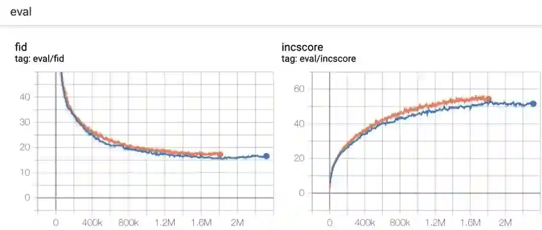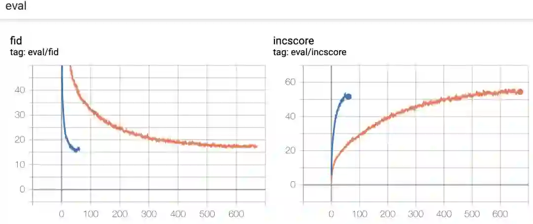 左图:将 Frechet Inception Distance 和 Inception Score 用作训练步骤的函数。右图:将 Frechet Inception Distance 和 Inception Score 用作训练时间的函数