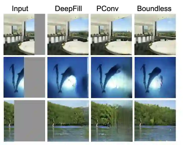 图像扩展的部分示例:右列为采用 TF-GAN 的新方法。与 DeepFill 和 PConv 这两种最先进的图像修复方法相比,此方法生成的对象形状更优(第一/第二行),纹理质量也很出色(第二/第三行)。输入图像已扩展至遮挡区域(左列灰色部分所示)。