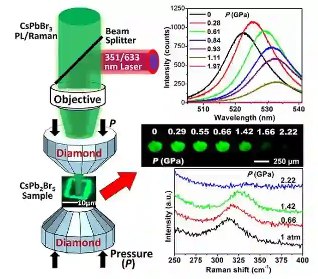 图2 通过双金刚石施加静水压测量CsPb2Br5纳米片荧光/拉曼的原理图(左),不同压力下的荧光光谱(右上),显微荧光照片(右中)和拉曼光谱(右下);点击阅读原文即可跳转本文。