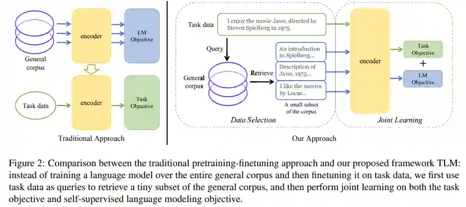 。这一框架从通用语料中筛选出与下游任务相关的子集,并将语言建模任务与下游任务进行联合训练。研究者们称之为