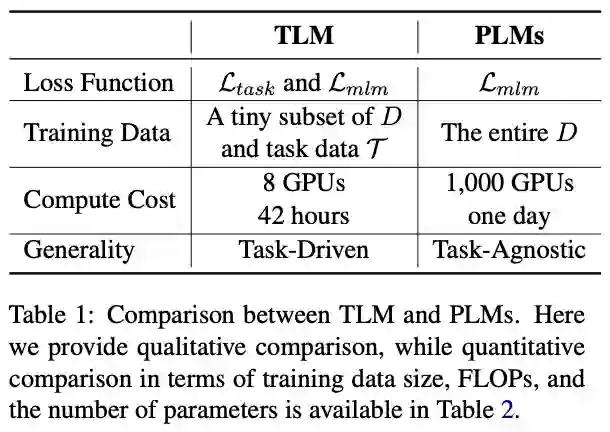 表格 1 直接对比了 TLM 和 PLM。整体来说,PLM 以极高的成本学习尽可能多的任务无关的知识,而 TLM 以非常低的成本针对每个任务学习相关知识。对比 TLM 和 PLM 有如下几个方面特点。