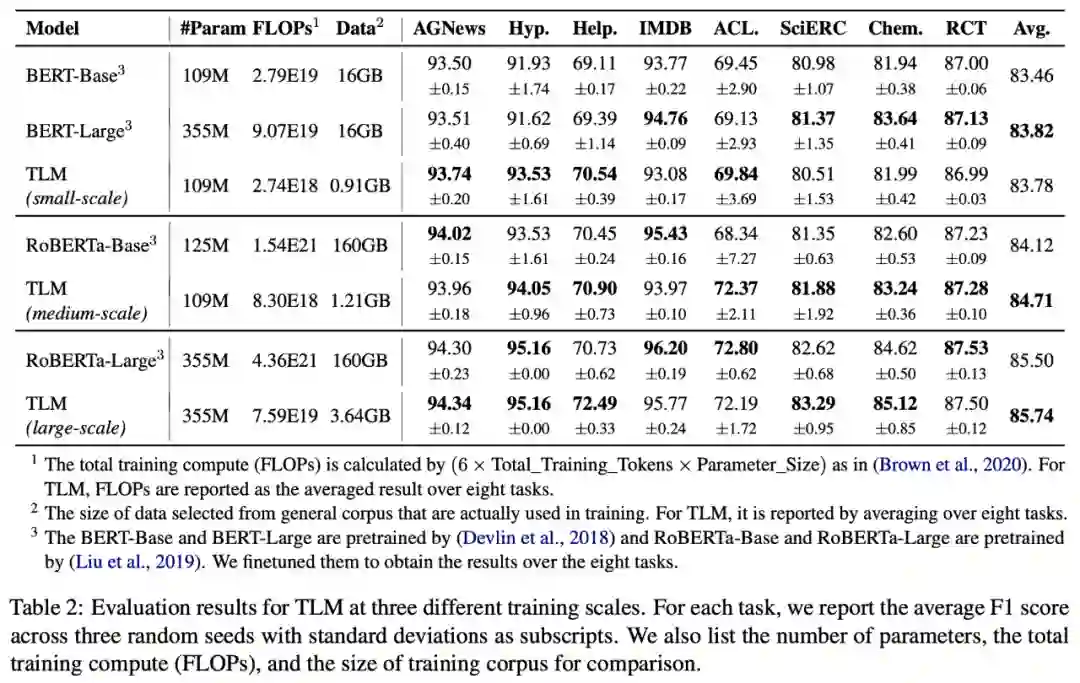 为了测试 TLM 的性能,研究者们在 8 个 NLP 分类任务上从三个不同规模展开了对比实验。这 8 个任务涵盖了计算机科学、生物医药、新闻、评论等 4 个领域,包括了训练样本数量小于 5000 的低资源任务(Hyperpartisan News, ACL-ARC, SciERC, Chemprot)和训练样本数量大于 20000 的高资源任务(IMDB, AGNews, Helpfulness, RCT),覆盖了话题分类,情感分类,实体关系抽取等任务类型。从实验结果可以看出,和对应预训练 - 微调基准相比,TLM 实现了相当甚至更优的性能。平均而言,TLM 减少了两个数量级规模的训练计算量 (Training FLOPs) 以及训练语料的规模。