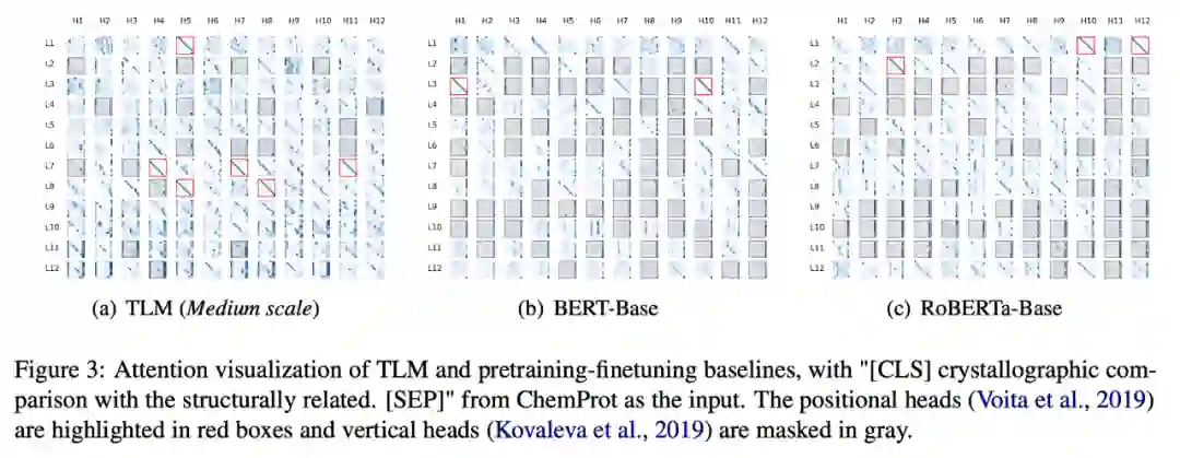 为了深入了解 TLM 的工作机制,研究人员对模型每个注意力头所输出的注意力分数进行了可视化。可以观察到,TLM 的注意力模式中包含了更多的「对角线」模式(图 3 红框),也即大多 token 都将注意力分数集中赋予了其邻近 token,这种模式已在前人的工作 [1] 中被证明对模型的最终预测有着重要贡献。而预训练模型(BERT, RoBERTa)中则包含了大量「垂直」模式的注意力头(图 3 灰色区域),也即大多 token 都将注意力分数集中赋予了 [CLS],[SEP] 或者句号这种毫无语义或者句法信息的词汇上。这一现象表明 TLM 中参数利用率要显著高于预训练语言模型,TLM 或许针对下游任务学习到了更加富有语义信息的表示。