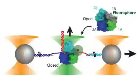 3、2015年光镊与荧光共振能量转移技术实现了结合研究,研究案例是UvrD解旋酶。蛋白的功能和三维结构之间的关系对于理解蛋白的作用机理是十分必要的。蛋白质执行某一功能,对应动态结构的改变,对于大多数技术是不能够直接观测的。即便是高精度的冷冻电镜技术也是由静态图片得到结构信息,相对应的动态功能只能够进行推测而不能直接观测。而光镊结合荧光共振能量转移技术可以进行实时动态研究。以UvrD解旋酶为例,光镊结果记录了UvrD解旋的过程,荧光共振能量转移同时监测了UvrD构象的改变。该实验首次记录了蛋白质功能和构象的实时变化。
