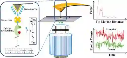 2、2012年发展了原子力显微镜和荧光共振能量转移结合。研究案例为HPPK蛋白的构象变化:对单个HPPK蛋白分子进行外力拉伸,原子力显微镜得到力谱曲线,同时荧光共振能量转移技术实时观测了HPPK蛋白构象的改变。