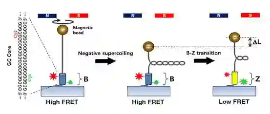 1、2010年实现磁镊与荧光共振能量转移技术的结合。研究案例为B-DNA与Z-DNA之间的转换:B-DNA是广泛被认知的DNA右手双螺旋结构,Z-DNA是左手双螺旋结构。通过磁镊对B-DNA进行负超螺旋化操纵,观测荧光共振能量转移效率的变化。