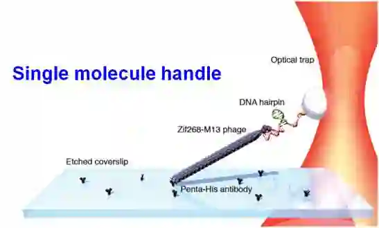 4、2013年采用光镊与DNA Origami(紧致的DNA束)结合来稳定研究的生物系统,提高光镊分辨率。一般光镊研究的生物系统是通过DNA双链作为手柄连接到微粒小球上。当手柄由双链DNA换做更为紧致的DNA Origami时,增加了系统的稳定系,提高分辨率。