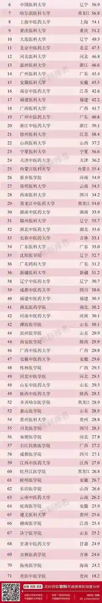 从上海医科高校看,作为"双一流"学科建设高校的上海中医药大学在排名中位列第8,是十强之中唯一中医药院校,也是沪上唯一一座上榜高校。需要说明的是,沪上海军军医大学(第二军医大学)作为军事院校,不在此次医科大学排名范围之内。