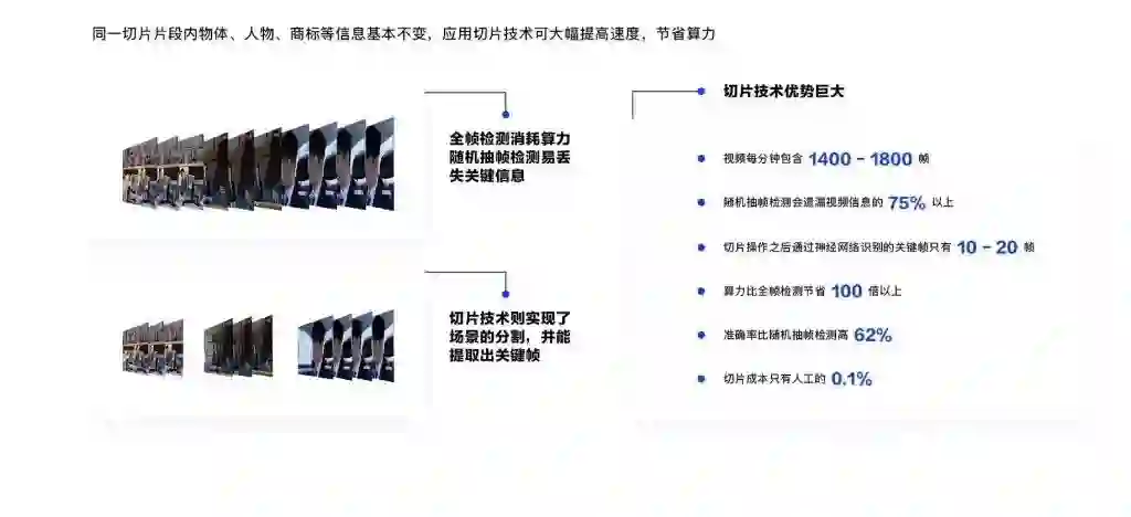具体来看,视频识别技术由图像识别技术发展而来,是将视频中的每一帧当成一副图像来进行识别。目前视频识别的预处理主要有两种方式:逐帧抽取和随机抽帧。逐帧抽取后的识别过程消耗算力大、成本高且由于信息冗余,大部分帧的识别白白消耗了机器的算力;而随机抽帧遗漏信息大,虽然节约了算力,但效果往往不好。据董天宇透露,目前国内随机抽帧遗漏的信息在 75% 以上,而周同科技利用成熟的切片技术,对视频中的镜头和场景变换进行分割,再根据视频片段的时长和画面提取关键帧。这种切片技术能够将视频的主要内容提取出来,进而对关键帧进行识别,可以在保留视频信息的同时节省算力和成本。