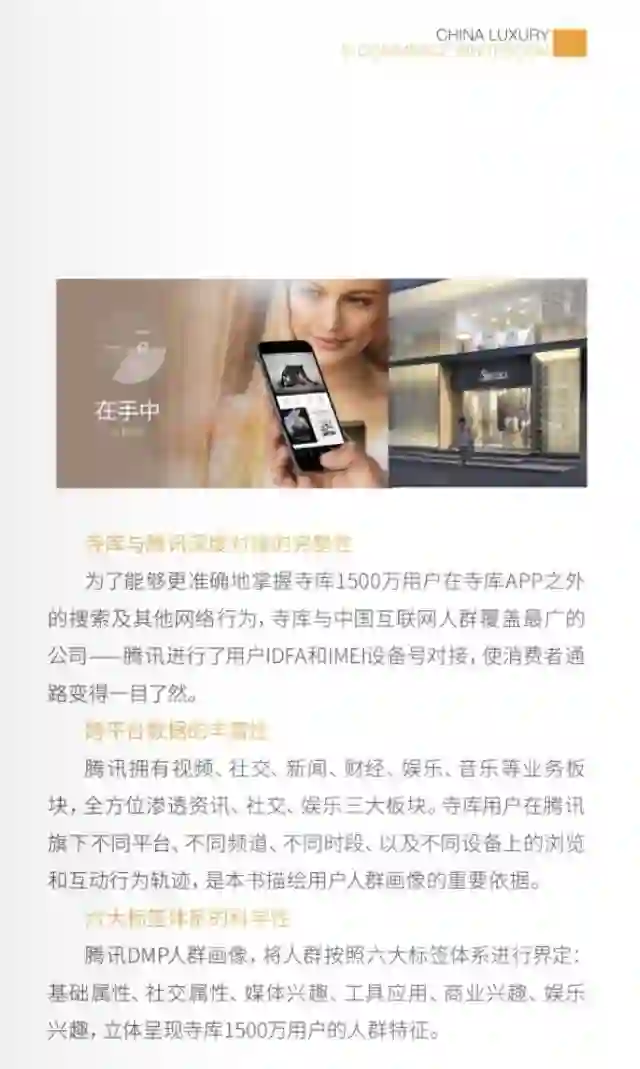 为继续填补奢侈品网络消费领域的大数据空白,《白皮书》阐明了奢侈品行业的发展现状和趋势,并以腾讯社交广告与寺库的深度合作为例,说明电商渠道正在帮助奢侈品品牌触达更多消费者。