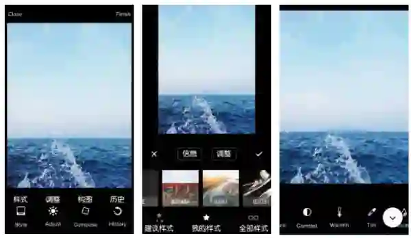 在功能上,虽说相比 Enlight 逊色一些,但也算是非常丰富,足够应付日常了。而 2.0 版的全手势操作,使 Snapseed 一跃成为 iOS 最易用的摄影后期应用之一,竖滑更改调节项,横滑调节效果强度,大部分操作都能通过一根手指完成,使移动端修片变得更为高效便捷。此外,2.0 全新的 UI 设计也为 Snapseed 平添一份时尚杂志的美感。功能齐全,界面精致,操作便捷,重点是完全免费,如果你不想在应用上花费太多的钱,Snapseed 会是你的首选。