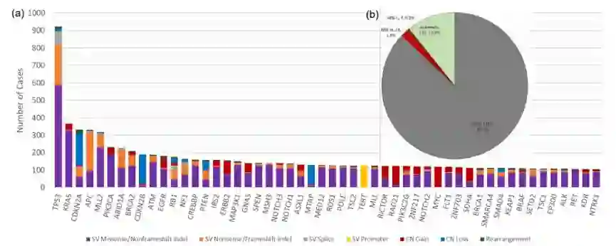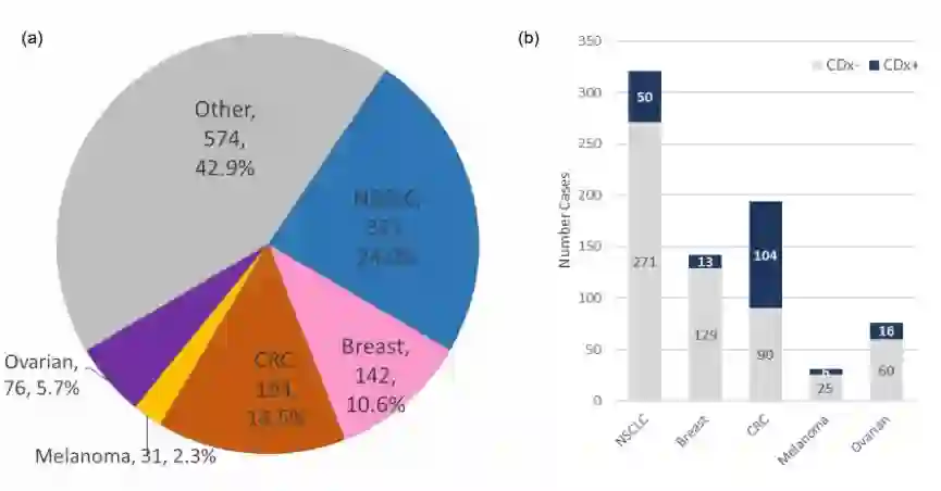 图3. (a)接受F1CDx检测的肿瘤类型分类;(b)CDx阳性的患者数量