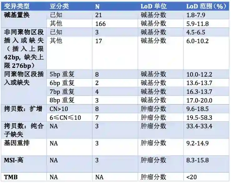 表2. F1CDx检测所有基因变异形式的分析敏感性(LoD)