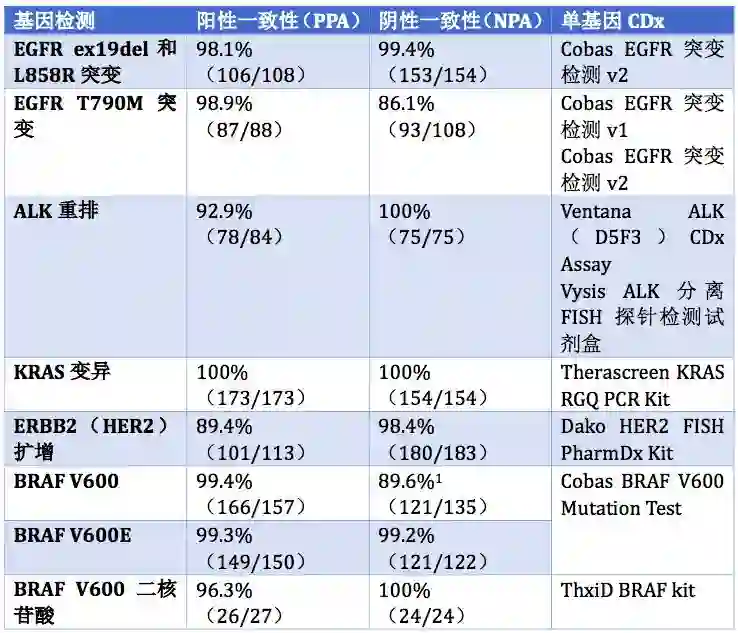 对F1CDx与单基因伴随诊断进行非劣效性验证,单基因伴随诊断包括EGFR cobas检测、BRAF突变检测、FISH和IHC检测ALK重排、FISH法检测ERBB2扩增和其他。评估两个检测方法的阳性一致性(PPA)和阴性一致性(NPA),总结见下表1。