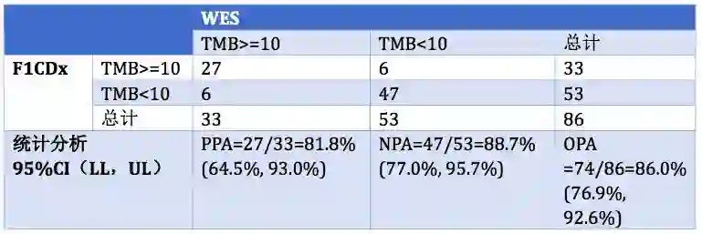 表4. 以TMB 10mut/Mb作为cutoff值,F1CDx与全外显子测序的分析一致性