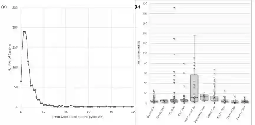 图5. (a)所有患者中的TMB分布;(b) CDx阳性的不同瘤种患者的TMB评分